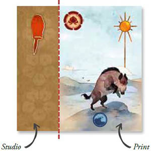 These cards depict the lessons taught by Hokusai and are made up of two parts that each have a different use: the Studio and the Print.