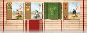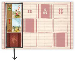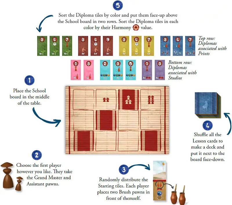 The first player (whoever has the Grand Master pawn) draws as many Lesson cards as there are players, and places them on the first row of the School board. These cards are placed face-up or face-down according to the instructions on the spaces on which they're played.