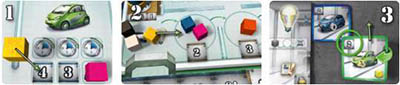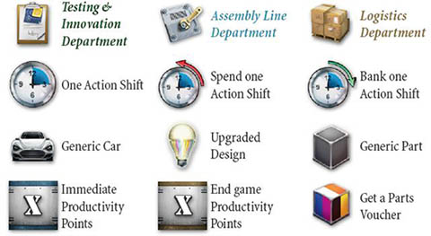 Next, in Certification Track order (right to left), take one available Car Part from Logistics Department, and a Design tile from Design Department, ignoring any benefits printed on the board.