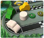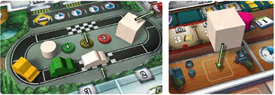 11 Place the Pace Car (white car) in either checkered space on the testing track, the Meeting token (big white cube), in the middle of the track, and the production cycle marker (white cylinder) on the '0' space of the Meeting track.