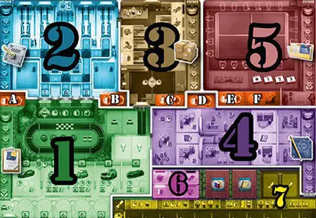 19 Shuffle the remaining 27 Design tiles, make 3 face-up decks with 9 tiles each, and place them in the 3 leftmost spaces of the department. The leftmost deck is called the 'Central' deck.
