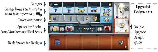 Place each car in any empty garage of your choice on your Player Board, and receive the benefit depicted on each garage you filled.