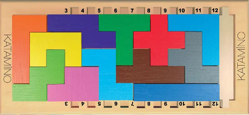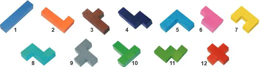There are 12 polygon pieces included in Katamino. Each of these pieces covers 5 spaces on the board and is called a Pentamino.