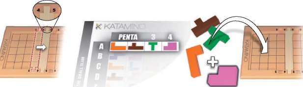The Small Slams consist of 42 PENTAS. To begin your first small slam, Place the slider on the board between numbers 3 and 4, and then take the first 3 Pentaminos shown on the table on line A until column 3 and complete the PENTA 3.