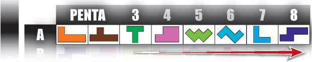Continue solving PENTAS, each time adding the Pentamino shown in the next column and moving the slider up one space until you have completed PENTA 8 of Line A.