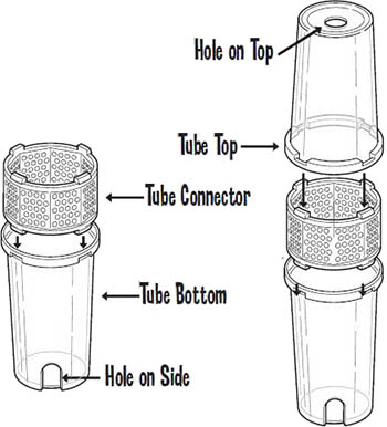 Line up the slots on the tube top (the cup with the opening in its top) with the tabs on the connector and snap the cup down firmly over the connector as shown.