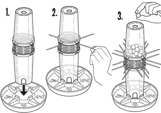 When all the sticks are inserted, load the marbles by dropping them through the opening in the top of the tube. The marbles will rest on top of the web of sticks. If any fall through onto the game base, just reload them until all the marbles rest on top of the sticks.