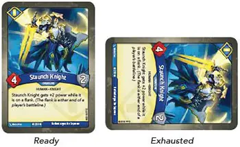 Exhausted cards are rotated 90 degrees to the side. An exhausted card is not able to be used until it is readied by a game step or card ability.