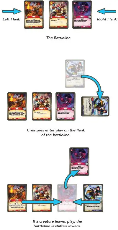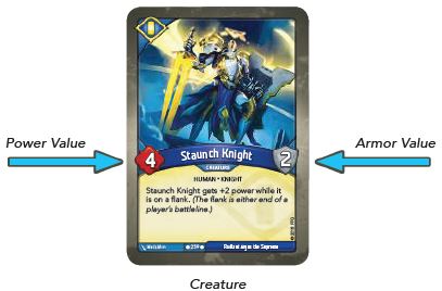 Creatures enter play exhausted and are placed in the front row of the active player's play area. This row is referred to as the battleline. Creatures remain in play from turn to turn, and they each have power and armor values that they use to resolve fights.