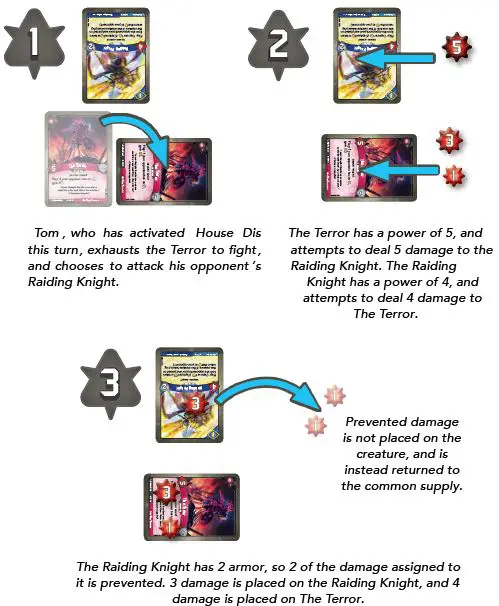 When a creature is dealt damage, place an amount of damage tokens equal to the amount of damage dealt on the creature. If a creature has as much or more damage on it as it has power, the creature is destroyed and placed on top of its owner's discard pile. If a creature has an armor value (to the right of the card's title), the armor prevents that much incoming damage each turn.