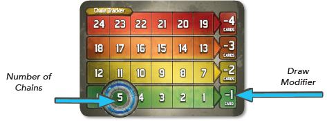 Each time (including during setup) a player with one or more chains would draw one or more cards to refill their hand, that player draws fewer cards (based on their current chain level, see below) and then sheds one chain by reducing their chain tracker by one.