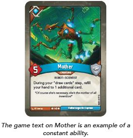 If a card has an ability that does not have a boldfaced precursor, the ability is a constant ability that is active so long as the card remains in play and meets all conditions specified by the ability.