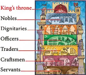The round ends as soon as a new King is crowned. All players now reveal their secret goals. Each player gains points (use the pencil and the note pad to keep track of the points) based on the position of his favorite characters in the castle: