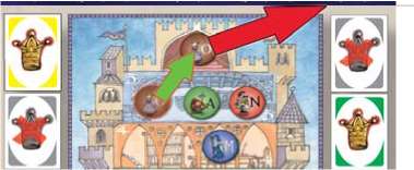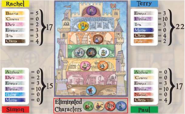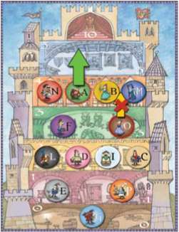Example: Rachel, Simon, Terry, and Paul have just finished placing the characters in the castle. It's Rachel's turn. She chooses to move Alighiero from the 4th floor (Dignitaries) to the 5th floor (Nobles).
