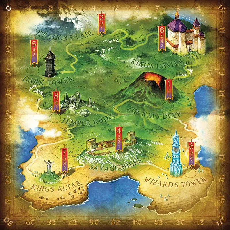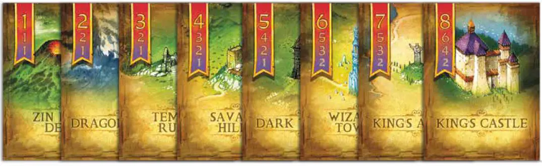 Place the game board in the center of the table. It depicts the kingdom, divided into eight Regions. Around the outside of the board is a scoring track, numbered 0-40.