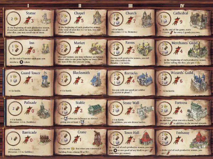 Place the game board in the center of the play area. Place the season marker on the Aid from the King space (#1) of the Calendar Track and the year marker on the first space of the Year Track (with the Roman numeral "I"). Place the white dice and the "+2" tokens on their matching space on the game board. Place the King's Envoy marker on the #5 space of the Calendar Track. …