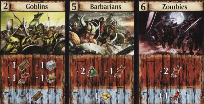 If your combat value is lower than the enemy strength, you have been defeated and must suffer the losses listed on the Enemy Card (gold, wood, stone, good of your choice, building, and VP).