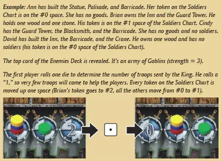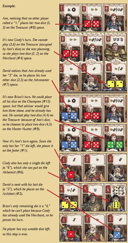 Example: The Jester awards one Victory Point to Ann: Ann moves her token ahead on the Scoring Track one space. There are no dice on the Squire, so he is ignored. The Architect donates one wood to David, who takes it from the supply. The Merchant lets Cindy choose whether she wants one gold or one wood. She already has a gold, so she goes for the wood. After ignoring the Sergeant (no dice on him), it's time to resolve the Alchemist. Cindy gives the wood she just acquired (from the Merchant) back to the supply and takes one gold and one stone.