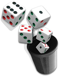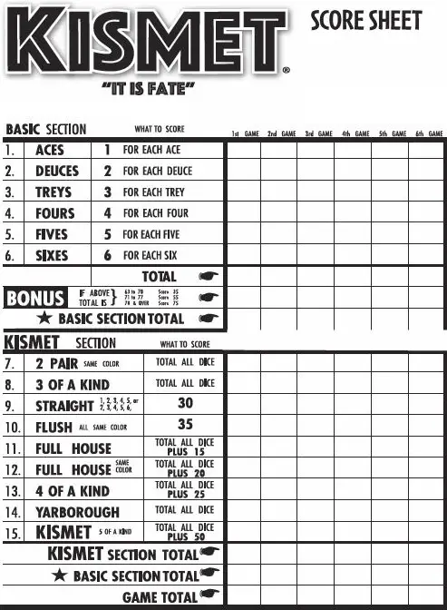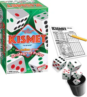 Kismet: Five of a like number. Total all dice and add 50 for the score. When more than one Kismet is rolled by one player in one game,.
