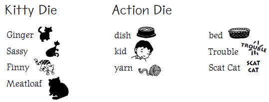 Then look over the bingo boards to see how one picture from the action die combines with one picture from the kitty die to match a square on the board.