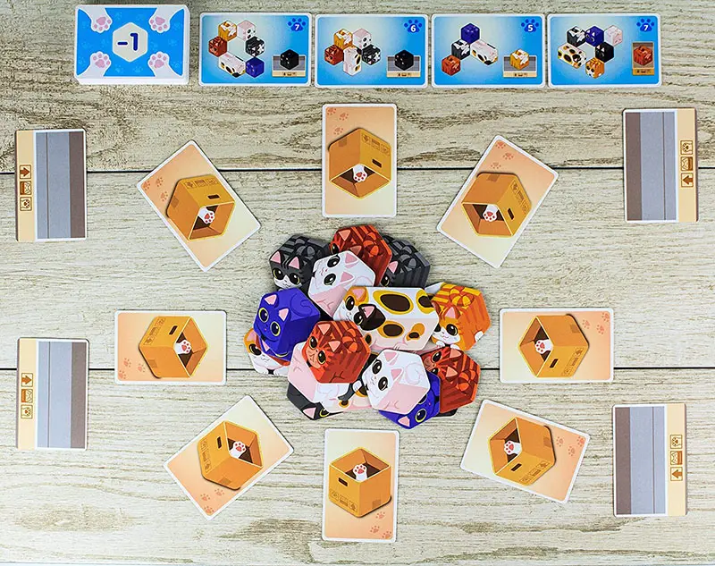 All Cat Box cards are shuffled the placed with "box" side up next to the Kitty tiles.