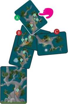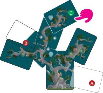 The newly added card can only touch one other card. You must not cover any of the features. Your branch card must not hang over the edge of the table.