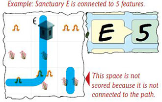Players draw paths on their play mats, trying to connect features (caterpillars and flowers ) to sanctuaries and guardians. At the end of ' each round, a sanctuary is scored as long as it is connected to more features than the previous sanctuary.
