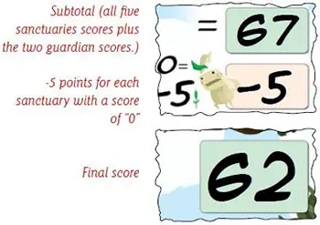 After the fifth sanctuary is scored, the game ends. (Note: One sanctuary will not be scored). Players tally their final score as follows: