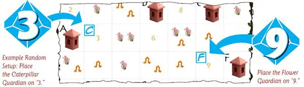 This will be the location of the caterpillar guardian. Repeat this process for the flower guardian, writing a small "F" in the upper corner of that space. Reroll the die if the two numbers rolled are the same.