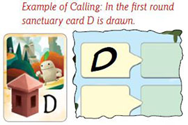The Caller begins the round by placing the top card of the sanctuary deck faceup in the sanctuary discard pile. This sanctuary will be scored at the end of this round. Each player writes the sanctuary's letter in the topmost available white box on the right side of their play mat.