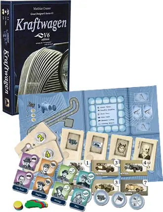 In Kraftwagen, players advance the state of automobile development and production by playing as start-up companies. They must research new technologies and build improved chassis and engines.
