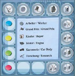 Each player takes a player mat and four workers of one color from the supply. The workers are placed in the canteen on his mat. The Grand Prix car has an engine value of "1 " at the start of the game.