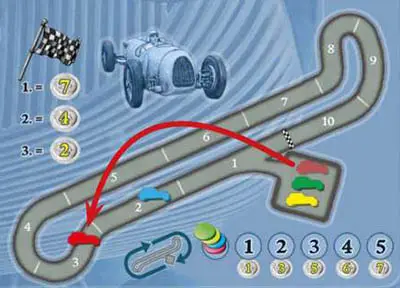 Grand-Prix Race: If the player is the first to complete one or two laps on the racetrack, he gets the corresponding markers worth 3 or 7 points.