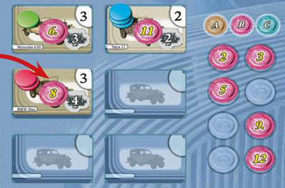 If a car has been sold, the owner takes its colored price marker and places it face-down in front of him. If a car has been sold to a buyer with price preference, the owner takes an additional white price marker of the same value as the colored price marker on the car from supply and places it face-down in front of him.