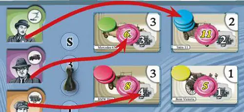 Example: The active buyers now purchase cars. The first buyer purchases the blue Tatra 11 because it has the largest prestige thanks to three workers. The blue player takes the price marker "11" and places it face-down in front of him.