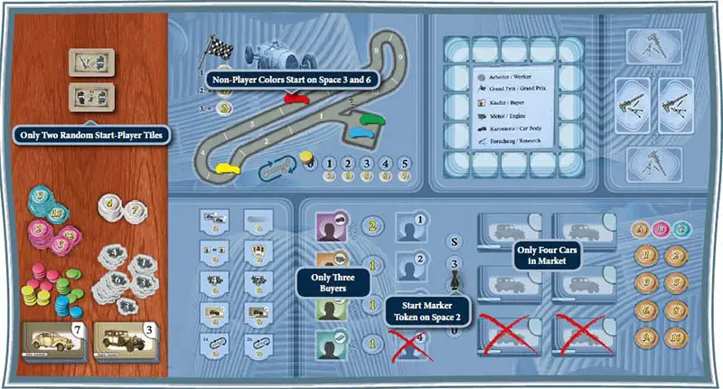 The two cars of the colors not in play are placed on space 3 and 6 of the Grand-Prix track. They will never move, however, they do "count" during the Grand-Prix scoring. If the two player cars are first and third, the players receive 7 and 2 points each turn.