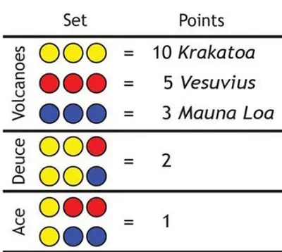 When a throw results in 3 different volcanoes, or 3 identical volcanoes, it is an Eruption, which gives you a bonus on your next 2 throws.