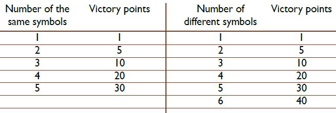 Victory points are awarded for sets of the same type of relic cards or for sets of different relic cards. Players may combine their cards in any way and may build as many sets as they wish, but each card can be used in only one set.