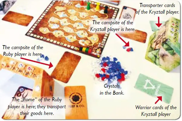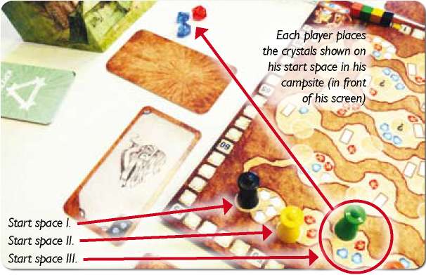 (In a 3-player game the figures are placed on spaces I. to III., in a 2 player game they are placed on space I. and space III).. Each figure's owner takes the number of crystals displayed on his starting space and puts them in their campsite.