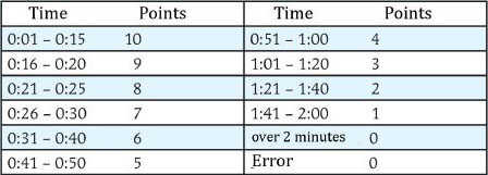 If the team completes the task so that so that both sides of the object constructed matches the view on the map exactly and none of the components remain, then points are awarded according to the amount of time the team took. The faster the team builds, the more points there are.