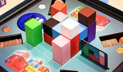 The players play in changing teams of two and try together to recreate the building depicted on a card. However, each of the two partners has a different view of the building that will need to be constructed.
