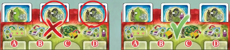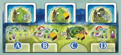 Th is identifies which card you will later use to perform a special function (the card under the A), which you will use to receive a new resource (the card under the B), and which you will use to advance a marker (the card under the D).