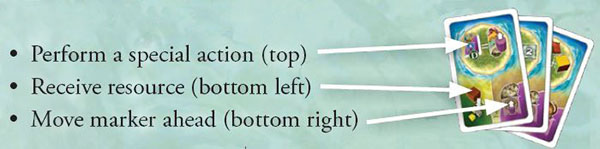 The iconography is always the same; in most cases, players can claim an additional resource from the general supply, or gain victory points or the right to move a purple marker, etc.