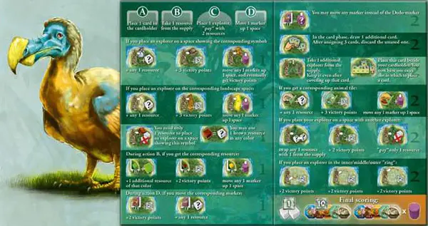 Since she has the large Dodo tile as well as one small Dodo tile, she scores a total of 3 victory points. All other players with Dodo tiles score nothing.
