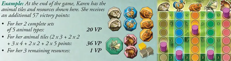 - For each animal tile the player possesses, the player scores victory points equal to the scoring multiplier (i.e. the value of the area occupied by that animal's purple marker).