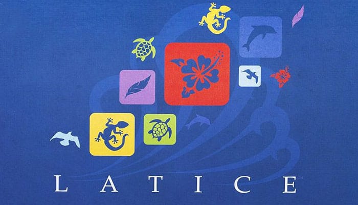 Latice is a strategy game where you match tiles by color and shape. The game comes with a game board, stones, and acrylic tiles. Most of the tiles contain one of six images (e.g., turtle, leaf, lizard, dolphin) in one of six colors.