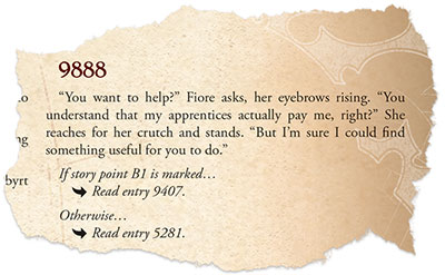 In the above example, if you choose the "Knock on the door" option, you are instructed to read entry 2979. However, if you choose the "Break down the door" option, you are instructed to mark story point N5 and then read entry 7363.
