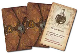 The twenty item cards should be kept in a facedown deck while playing. You will be instructed to gain some of these cards during your adventures. Do not examine the front face of any card until you are instructed to gain that card. The back of each card indicates its unique identifier ("A", "B", "C", etc)..