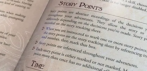 Story points are abstract recordings of the decisions you make throughout your adventures. They allow the story to play out differently depending on the decisions you've made. Story points are recorded on the story tracking sheet.