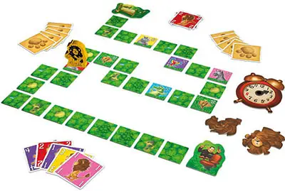 The path tile shows an animal, and the colour matches the colour of the just-played card: Lucky you! Leo doesn't lose any time. The clock hand is not moved ahead.